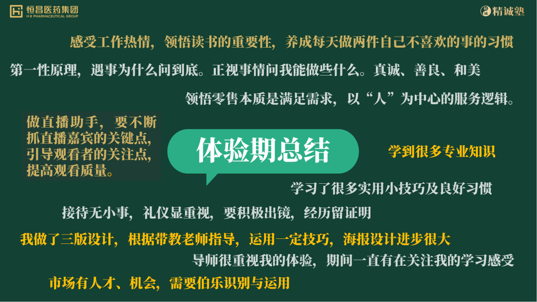 集训期结束,学员自主报名开启为期1周的体验期,以“深入感受恒昌文化,提升从事医药行业信心、培养良好工作习惯、启蒙正确价值观和事业观”为目标,通过人岗匹配、任务牵引、实战业务、导师带教及复盘总结,让学员在真实业务场景中学习企业运作逻辑,探索经营管理之道。