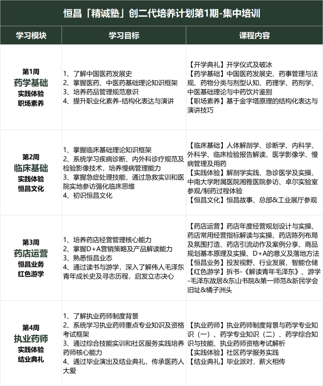 - 课程:小班教学,四周集训,每周围绕“医药专业、恒昌视野、实践体验”三个模块设计课程