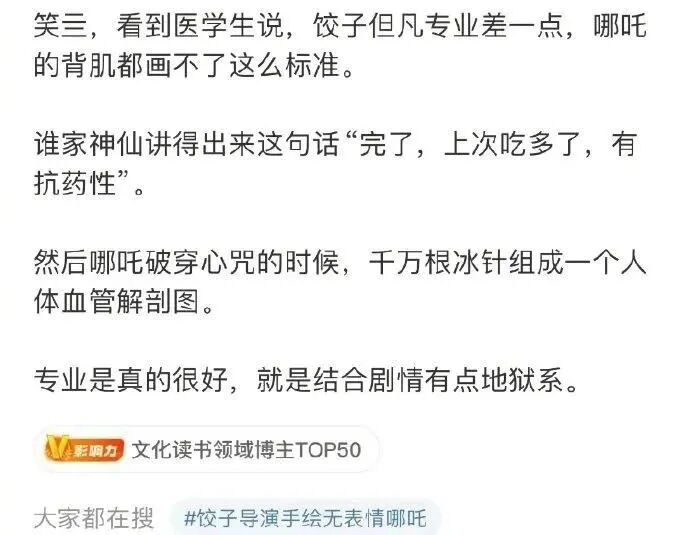 票房神话的背后,其导演饺子(杨宇)的医学背景,也意外成为这场票房盛宴的“隐藏彩蛋”。饺子毕业于华西医科大学(现四川大学)药学院,弃医从影的他,将医学的严谨性完美融入动画创作。饺子曾调侃:“学医的经历让我对细节有近乎强迫症的执着。”这种近乎苛刻的细节把控力,在《哪吒》系列中体现得淋漓尽致——《哪吒之魔童降世》剧本打磨66稿,哪吒人物设计超100版,全片80%特效镜头反复修改。《哪吒之魔童闹海》作为续作,制作团队在原有基础上进行了全方位升级。仅露出10秒的穿心咒画面,饺子和团队就反复打磨了一年。医学训练赋予的“解剖式思维”,让他对角色骨骼、肌肉运动轨迹的刻画精确到毫厘,甚至亲自表演关键动作供动画师参考。有医学生网友看完《哪吒2》说,饺子但凡专业差一点,哪吒的背肌都画不了这么标准;
