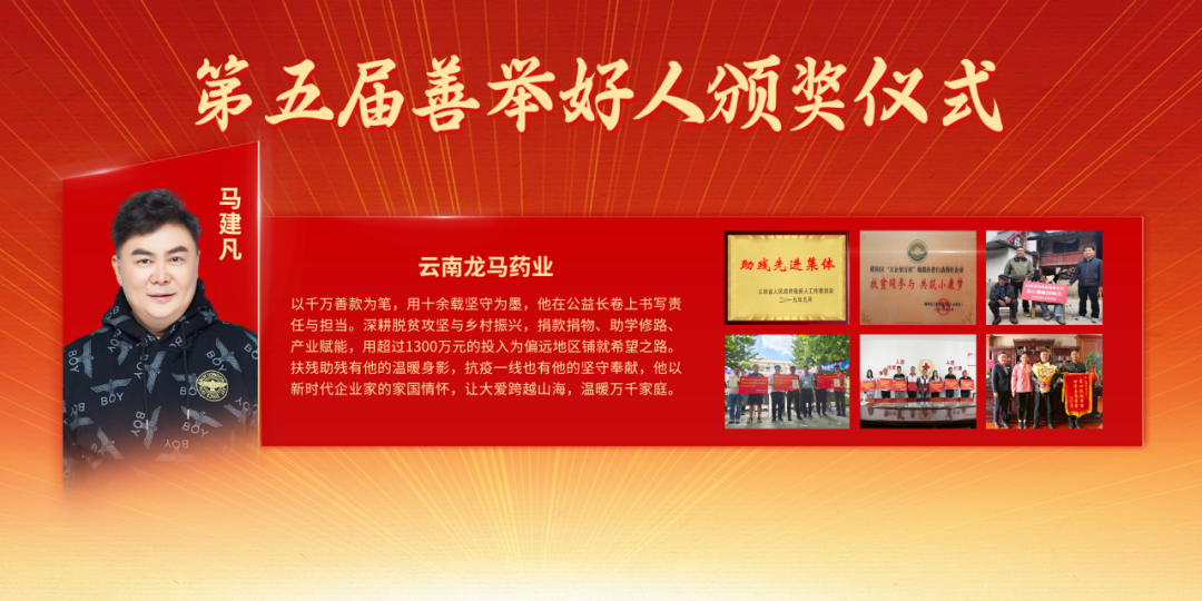 云南龙马药业马建凡,以千万善款为笔,用十余载坚守为墨,他在公益长卷上书写责任与担当。深耕脱贫攻坚与乡村振兴,捐款捐物、助学修路、产业赋能,用超过1300万元的投入为偏远地区铺就希望之路。扶残助残有他的温暖身影,抗疫一线也有他的坚守奉献,他以新时代企业家的家国情怀,让大爱跨越山海,温暖万千家庭。