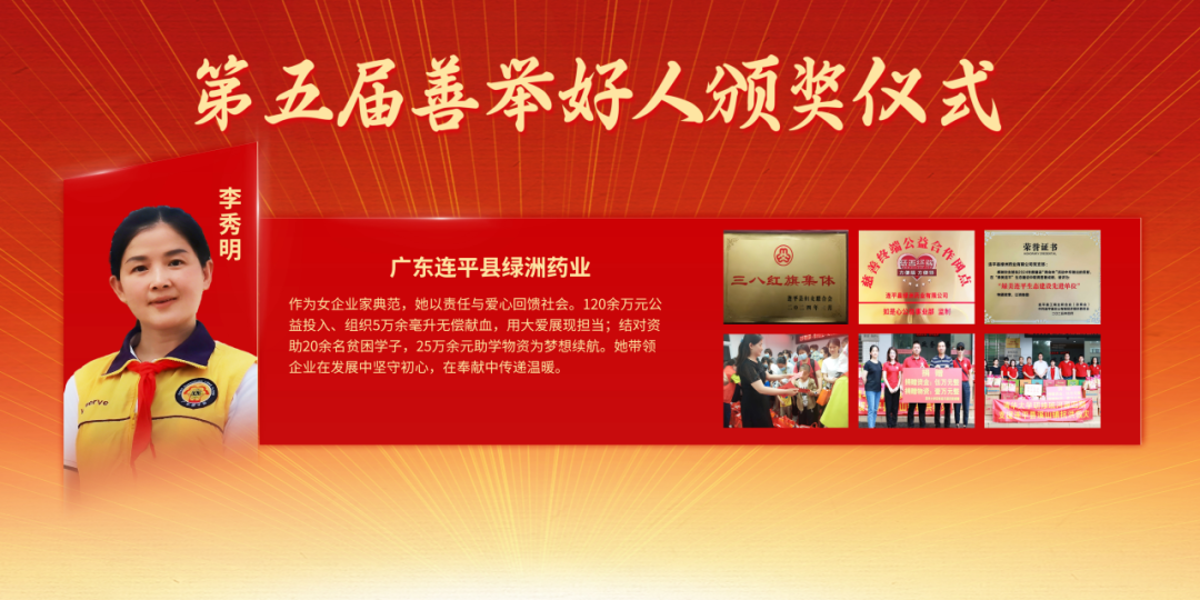 广东连平县绿洲药业李秀明,作为女企业家典范,她以责任与爱心回馈社会。120余万元公益投入、组织5万余毫升无偿献血,用大爱展现担当;结对资助20余名贫困学子,25万余元助学物资为梦想续航。她带领企业在发展中坚守初心,在奉献中传递温暖。