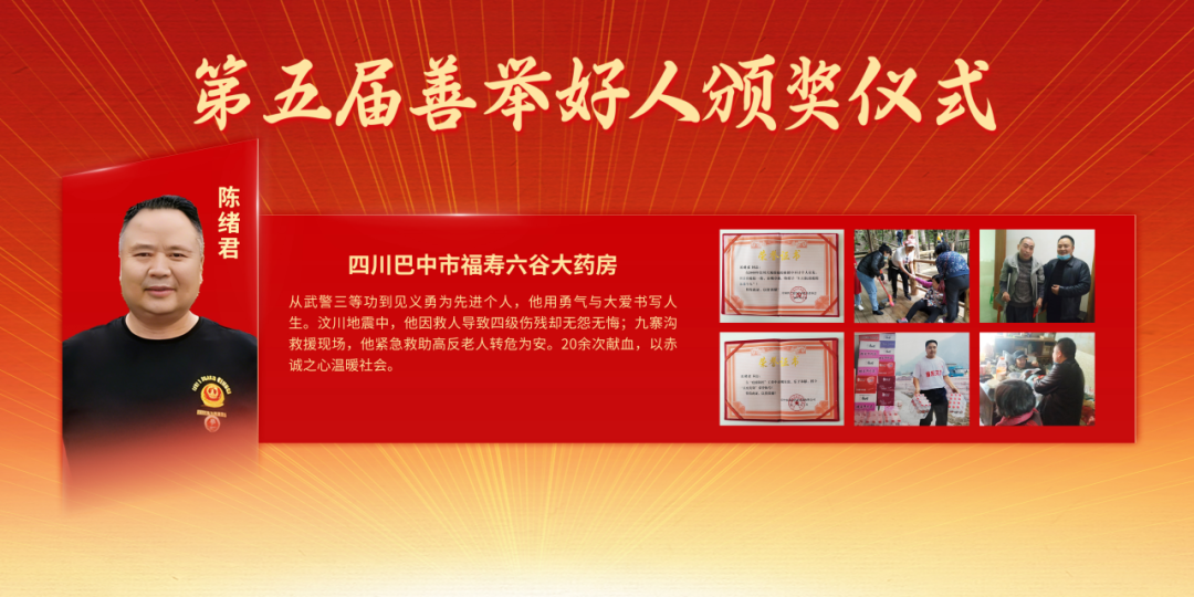 四川巴中市福寿六谷大药房陈绪君,从武警三等功到见义勇为先进个人,他用勇气与大爱书写人生。汶川地震中,他因救人导致四级伤残却无怨无悔;九寨沟救援现场,他紧急救助高反老人转危为安。20余次献血,以赤诚之心温暖社会。