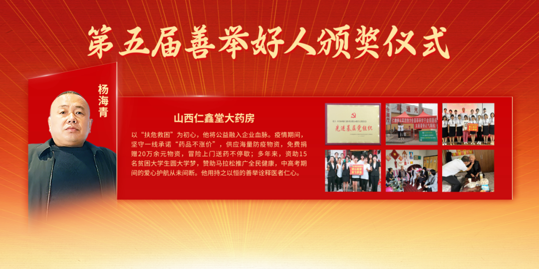山西仁鑫堂大药房杨海青,以“扶危救困”为初心,他将公益融入企业血脉。疫情期间,坚守一线承诺“药品不涨价”,供应海量防疫物资,免费捐赠20万余元物资,冒险上门送药不停歇;多年来,资助15名贫困大学生圆大学梦,赞助马拉松推广全民健康,中高考期间的爱心护航从未间断。他用持之以恒的善举诠释医者仁心。