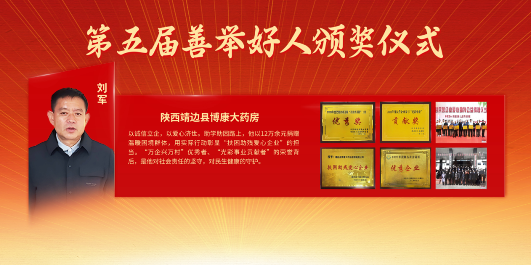陕西靖边县博康大药房刘军,以诚信立企,以爱心济世。助学助困路上,他以12万余元捐赠温暖困境群体,用实际行动彰显“扶困助残爱心企业”的担当。“万企兴万村”优秀者、“光彩事业贡献者”的荣誉背后,是他对社会责任的坚守,对民生健康的守护。