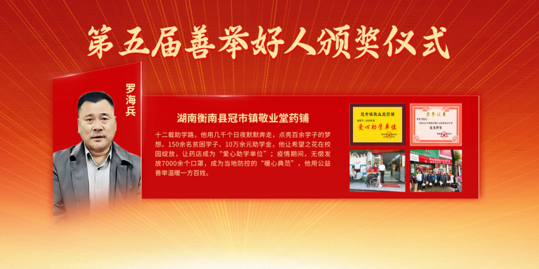 湖南衡南县冠市镇敬业堂药铺罗海兵,十二载助学路,他用几千个日夜默默奔走,点亮百余学子的梦想。150余名贫困学子、10万余元助学金,他让希望之花在校园绽放,让药店成为“爱心助学单位”;疫情期间,无偿发放7000余个口罩,成为当地防控的“暖心典范”,他用公益善举温暖一方百姓。