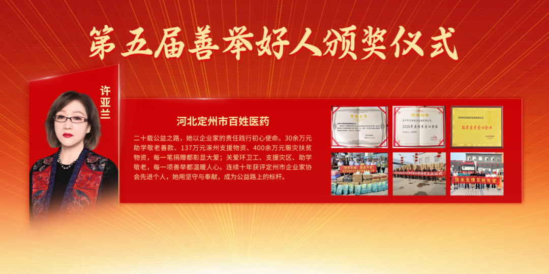河北定州市百姓医药许亚兰,二十载公益之路,她以企业家的责任践行初心使命。30余万元助学敬老善款、137万元涿州支援物资、400余万元赈灾扶贫物资,每一笔捐赠都彰显大爱;关爱环卫工、支援灾区、助学敬老,每一项善举都温暖人心。连续十年获评定州市企业家协会先进个人,她用坚守与奉献,成为公益路上的标杆。
