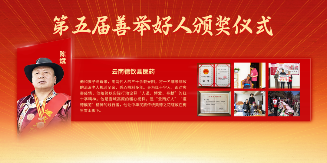 云南德钦县医药陈斌,他和妻子、母亲,用两代人的三十余载光阴,将一名非亲非故的流浪老人视若至亲,悉心照料多年。身为红十字人,面对灾害疫情,他始终以实际行动诠释“人道、博爱、奉献”的红十字精神。他是雪域高原的暖心榜样,是“云南好人”“道德模范”精神的践行者,他让中华民族传统美德之花绽放在梅里雪山脚下。