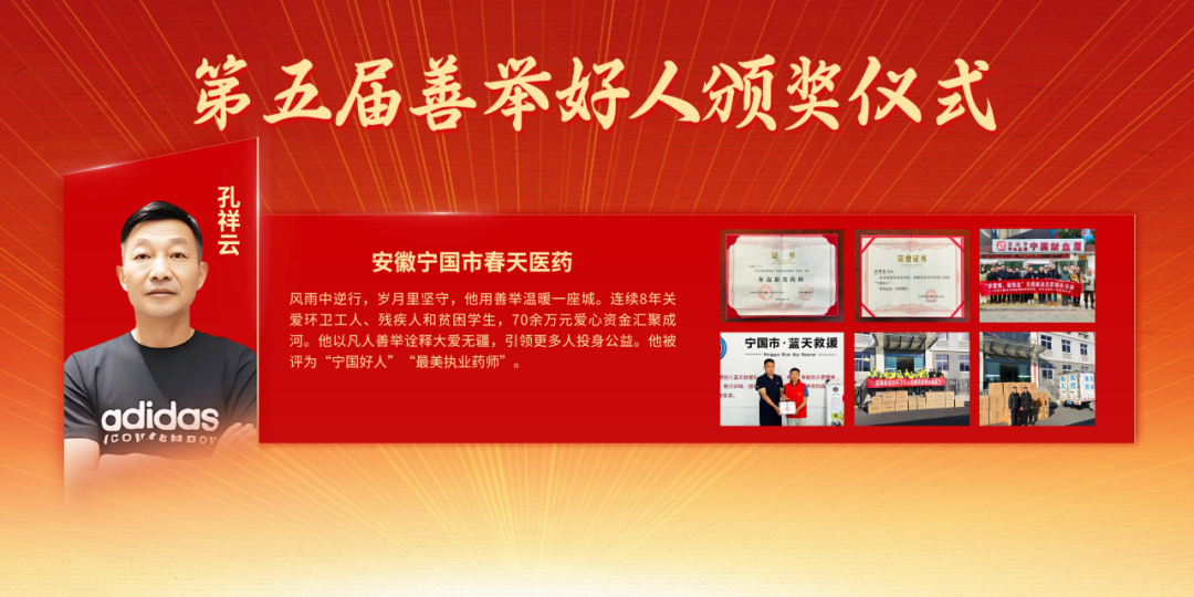 安徽宁国市春天医药孔祥云,风雨中逆行,岁月里坚守,他用善举温暖一座城。连续8年关爱环卫工人、残疾人和贫困学生,70余万元爱心资金汇聚成河。他被评为“宁国好人”“最美执业药师”,以凡人善举诠释大爱无疆,引领更多人投身公益。