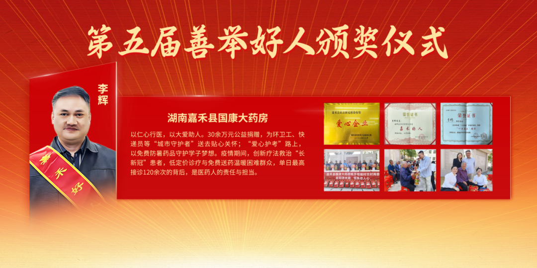 湖南嘉禾县国康大药房李辉,以仁心行医,以大爱助人。30余万元公益捐赠,为环卫工、快递员等“城市守护者”送去贴心关怀;“爱心护考”路上,以免费防暑药品守护学子梦想。疫情期间,创新疗法救治“长新冠”患者,低定价诊疗与免费送药温暖困难群众,单日最高接诊120余次的背后,是医药人的责任与担当。