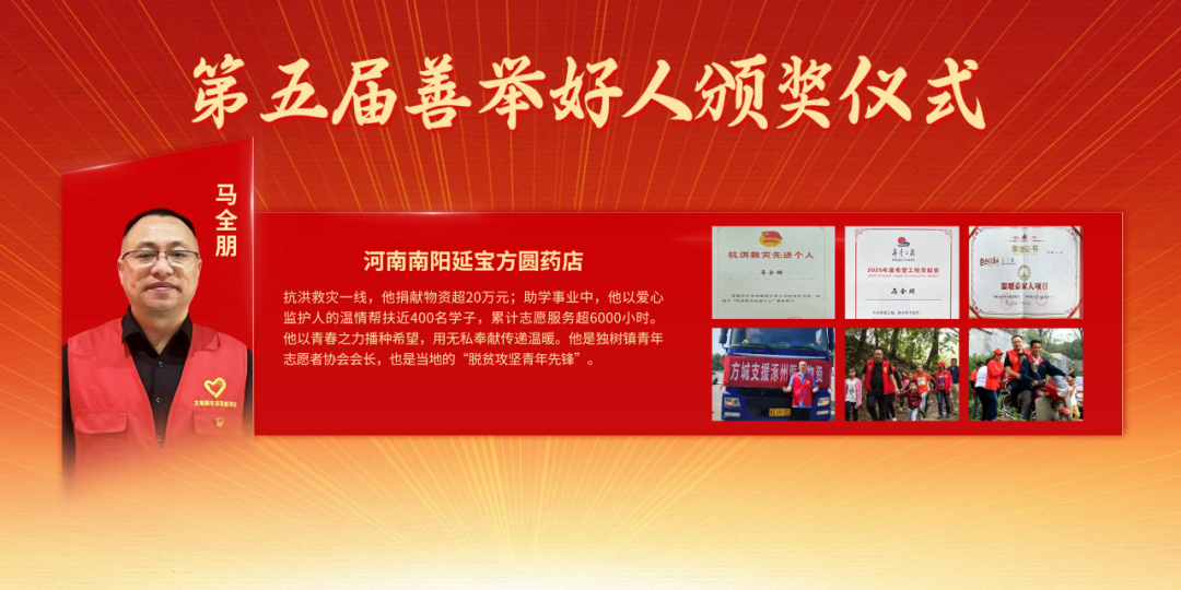 河南南阳延宝方圆药店马全朋,在抗洪救灾一线,他捐献物资超20万元;助学事业中,他以爱心监护人的温情帮扶近400名学子,累计志愿服务超6000小时。他以青春之力播种希望,用无私奉献传递温暖。他是独树镇青年志愿者协会会长,也是当地的“脱贫攻坚青年先锋”。
