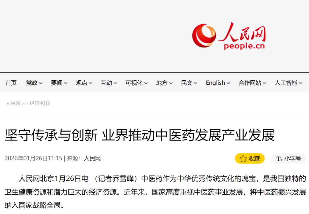 人民网北京1月26日电 (记者乔雪峰)中医药作为中华优秀传统文化的瑰宝,是我国独特的卫生健康资源和潜力巨大的经济资源。近年来,国家高度重视中医药事业发展,将中医药振兴发展纳入国家战略全局。