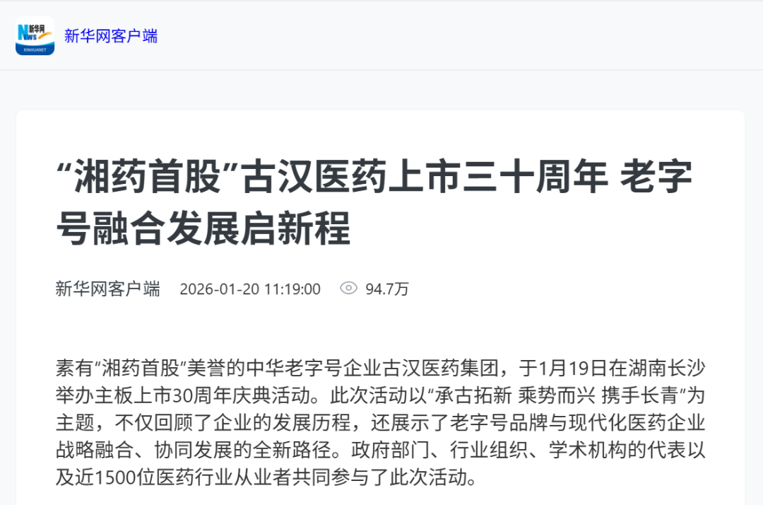 当前,我国中医药事业迎来了新的发展契机。古汉医药以上市三十周年为崭新起点,通过战略融合、数字转型、文旅结合与智能化升级,正推动这一承载千年汉方智慧的老字号品牌焕发出新的生机与活力,为中医药的振兴发展贡献自身力量。